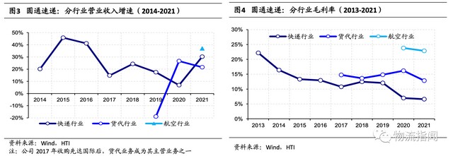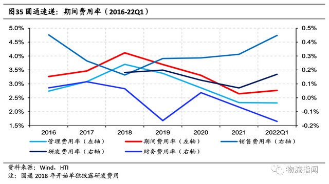 二、第二增长曲线:航空货运业务及国际业务圆通于2015年和2017年分别布局航空业务及国际业务,为发展综合物流服务做铺垫。2021年,货代业务和航空业务收入占营业收入的比例分别为9.76%和3.40%。1.圆通国际:逆势增长随着新冠疫情变异毒株的不断演化和在全球的快速扩散,国际物流供应链恢复缓慢,供给侧要素资源紧缺的局面仍在持续。此外,受消费升级、制造业转型升级、全球供应链重构等影响,跨境航空物流需求持续保持旺盛,航空物流在全球供应链中的重要地位愈发凸显。受疫情影响,国际航空货运业务近两年保持较高景气度,圆通国际充分受益。2020年,圆通国际营业收入为50.48亿港元/+29.5%,归母净利润为2.52亿港元/+866.3%,毛利率为15.3%,较2019年增加1.2个百分点。航空货运作为圆通国际第一大业务板块,在2020年逆势增长,货运量与业务收入均实现了大幅提升。其中,健康及医疗用品的需求上升为公司收入做出了巨大贡献,并导致净利润大幅增加。2020年,航空货运业务收入为30.63亿,同比增长39.1%,占营收比为60.7%;毛利润同比增长90.8%。2021年,圆通国际营业收入为75.56亿港元/+49.7%,归母净利润为2.73亿港元/+8.4%,毛利率为10.5%,较2020年下滑4.8个百分点。2021年,业绩增长主要受益于海运集装箱空间需求以及海运集装箱运费上涨导致海运业务收入及利润大幅增加。2021年,海运业务收入为20.04亿,同比增长145.2%,占营收比为26.5%;毛利润同比增长90.8%。2.圆通航空:乘势发展2020年,圆通航空实现营业收入11.93亿元,归母净利润2.16亿元,同比增长超200%。2021年,圆通航空实现归母净利润2.73亿元。疫情之下,受市场需求刺激,国内的航空物流业务发展迅猛。但截至2022年3月,国内现有的全货机航空公司有10家,拥有的全货机仅为173架,发展仍然处于初级阶段。2022年2月,民航总局发布了《“十四五”航空物流发展专项规划》,要求推动国内物流网络畅通高效,建立灵活的货机引进机制,支持货运航空公司壮大货机规模,发展航空货运。在政策的大力支持下,圆通可以发挥自有航空优势,加快海外航线网络覆盖,深度拓展自有航空的商业化运营,并加强圆通速递国际与圆通航空的联动与协同,持续优化和升级跨境物流产品与服务链路。2022年以来,圆通航空已有3架新货机投入运营,按照飞机引进计划,Q3圆通还将引进多架B767、B757等主力型号货机,全球首架客改货ARJ21-700国产货机也将于年底服役。我们预计到2022年底,圆通航空机队规模将达到20架左右。3.期间费用稳定,经营性现金流改善2016-2022Q1,公司的期间费用占营收的比例一直维持在2.5-4.2%之间,相对较为稳定,并且从2018年开始,期间费用率呈现逐年下降的趋势。其中,管理费用占主要部分,2018年,圆通管理费用大幅提升主要系合并圆通国际管理费用所致。此后,圆通的管理费用率连年下降,主要由于:1)业务量持续增长的同时,管理水平也在不断提升,从经验管理向数字管理转变;2)将原“管理费用”中的研发费用重分类至“研发费用”单独列示。依托加盟模式,圆通速递与加盟商建立了互惠共赢的合作关系,从而以较低的广告营销费实现较快的业务增长。