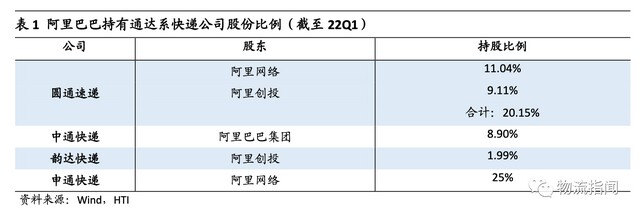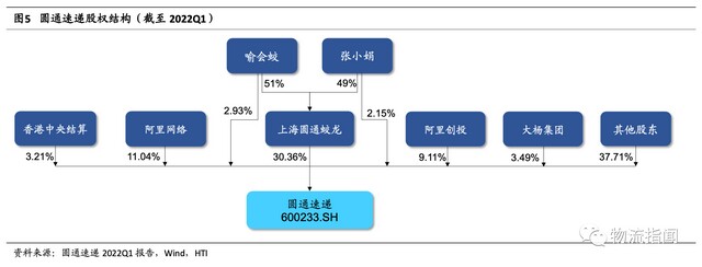 快递行业营业收入增速波动较大,2017年增速大幅下滑主要系个别网点经营调整导致快件滞留,2020年受疫情及价格战影响,公司快递业务收入增速再度下滑。2021年,公司深化服务质量战略定位,产品竞争力和定价能力显著提升,叠加行业格局持续改善,公司快递行业营业收入同比增长30.24%。受疫情影响,国际航空货运业务近两年保持较高景气度,圆通国际充分受益。航空货运作为圆通速递国际第一大业务板块,在2020年逆势增长,货运量与业务收入均实现了大幅提升。电商快递同质化严重,竞争较为激烈,单票收入逐年下降,受此影响,公司快递行业毛利率从2013年的22.16%下降至2021年的6.6%。货代行业和航空行业的毛利率分别维持在15%及23%的水平。公司实控人为喻会蛟、张小娟夫妇,第二大股东为阿里巴巴。根据2022Q1报告,公司控股股东上海圆通蛟龙投资发展有限公司持股占比为30.36%,实际控制人为喻会蛟、张小娟夫妇,二人及其控制企业合计持有股份占公司总股本的35.44%。喻会蛟先生为圆通速递的法定代表人,2019年4月辞去公司总裁职务,现任公司董事局主席。公司第二大股东为阿里网络,持股比例为11.04%。