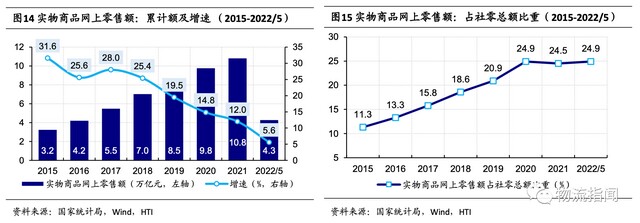 自疫情出现以来,“宅经济”加快新型消费模式的发展,线上消费需求持续增长。2021年,全国网上零售额同比增长14.1%,其中,实物商品网上零售额增长12%,占社会消费品零售总额的比重为24.5%。2022年1-5月,受疫情影响,消费有所停滞,社会消费品零售总额同比下降1.5%。但是,线上消费仍然较为活跃,实物商品网上零售额同比增长5.6%,占社会消费品零售总额的比重达到24.9%,较1-4月份提高1.1个百分点。疫情之下,快递业务量短期虽受扰动,但是长期需求仍有支撑。2020年1-2月,受武汉疫情影响,快递业务量出现阶段性波动,同比下滑10.1%。但是,在疫情的催化下,消费结构升级转型,网购线上渗透率逐步攀升,也为快递增添新动力。2020年5-12月快递业务量增速均高于2018-2019年同期水平,形成先抑后扬的局面。2022年4月,疫情冲击之下,快递物流运营承压,业务量同比下滑11.9%,降幅超过首轮疫情期间水平;5月,业务量增速转正,同比增长0.2%。我们认为,疫情对快递行业的影响是短暂的,疫情过后,消费有望迎来一波“报复性”反弹,并且随着物流压力有序缓解,积压的快递需求将逐步释放,预计2022年全年业务量增速仍有望保持在12%以上。