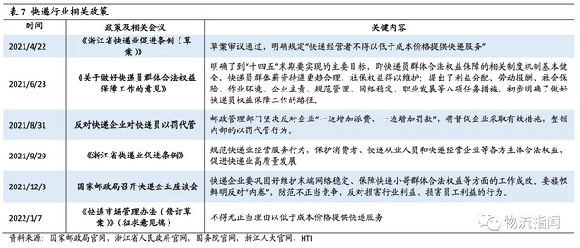 二、政策持续加码,引导行业回归理性竞争电商快递公司的产品和服务同质化程度高,价格竞争成为很多电商快递公司扩大份额的主要手段。同时,资本助力新的竞争者入局电商快递市场,低价竞争成为新进入者快速抢占市场的主要策略。2020年起,低价抢量的手段冲击电商快递行业原有竞争格局,价格战愈演愈烈,行业单票收入增速不断回落。2021年1月,单票收入增速降至低点-22.84%。随后,监管部门多次出台相关政策,整治快递业恶性价格战乱象。2021年9月,《浙江省快递业促进条例》的出台是电商快递价格战放缓的重要标志。同时,针对交通运输部、国家邮政局等七部门联合印发的《关于做好快递员群体合法权益保障工作的意见》,主要快递服务企业于9月普遍上调派费,切实提高业务员投递报酬,保障快递小哥权益。叠加“双十一”等旺季的到来,快递行业服务单价有所提升,价格竞争态势明显放缓,行业价格持续回归合理水平。