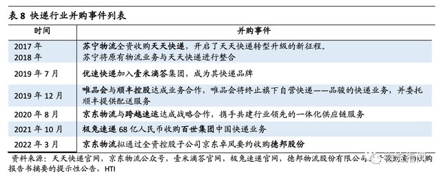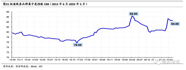 三、行业格局:龙头份额战持续,市场集中度提升2021年,快递行业内并购整合事件加速部分品牌和企业出清,市场向头部企业聚集演化。2022年1-5月,CR8指数达到84.6。我们认为,随着头部快递企业规模效应及成本优势进一步显现,部分中小型快递企业或将逐步退出市场,快递行业集中度仍具备一定提升空间。