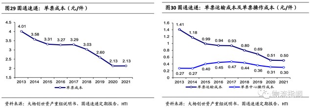 3.成本:深化聚焦成本管控,核心成本连年下降2015-2017年,圆通单票成本一直稳定在3.25元以上的水平。2018-2020年,公司的单票成本呈现明显下降趋势。一方面是由于公司深化落实成本管控各项举措,以数字化管理工具为抓手,精细化管控全链路、全流程的各项成本,细化考核数据下沉单元;另一方面是由于公司从2018年开始加大资本开支力度,并且增加机器设备和运输设备的投入比例,随着业务量的不断提升,规模效应逐渐显现。运输成本:2021年,公司进一步完善运能体系,提升自有运输车辆占比,并提高双边运输车辆、大型运输车辆、甩挂车辆的比例及自有车辆及社会车辆的综合利用率。公司运能成本管控精细深化,在成品油价格提升和各项税费优惠政策取消的影响下,2021年公司单票运输成本为0.50元,与去年同期基本持平。中心操作成本:公司全面推行创新管理模式,细化转运中心管理颗粒度直达最小业务单元,并持续提升转运中心、城配中心的自动化、智能化水平,推广布局自动化分拣设备,减少分拣次数,提高分拣操作效率及精准度。2021年,公司人均效能同比提升近12%,单票中心操作成本0.30元,较去年同期下降0.01元。