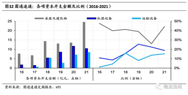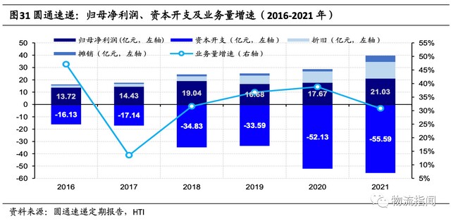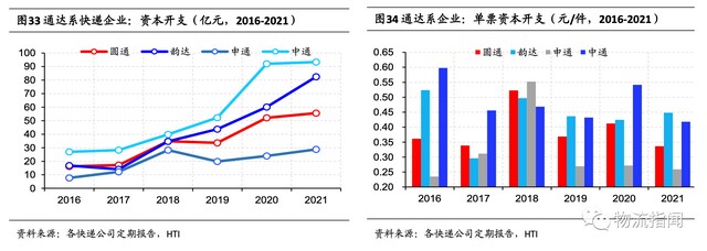 2016-2017年,圆通的资本开支基本保持在和净利润持平的状态,中通在2016年的资本开支为26.89亿元。2018-2021年,圆通开始加大资本开支的力度,资金投入约为其净利润的1.8-3倍,同期快递业务量也维持稳定增长的状态。