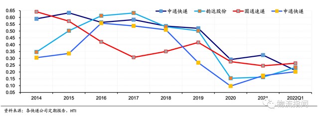 龙头份额战仍在上演。2013年至今,受益于早期对分拣等设备的大量投入以及有效的网络管理能力,中通快递的市场份额稳步提升,并于2016年实现弯道超车。此后,中通不断加大对核心资产(土地+厂房+车辆+分拣设备)的投入并保持高效的网络管理水平,一直占据市场份额第一的位置。2013-2015年,圆通的市场份额一直高于中通和韵达,但是由于公司2016年底相关价格政策调整未达预期以及2017年年初个别网点经营调整导致快件滞留对公司经营造成了短暂负面影响,2017年圆通的市场份额大幅下滑。圆通随即迅速做出调整,2018年,公司持续加大对转运中心、城配中心、终端建设、运能体系等方面的投入,不断提升自动化水平,网络服务能力显著提升。2019年,潘水苗上任后,紧抓公司信息化建设,秉持互联网思维打造先进信息化工具,深度融入业务运营。通过先进信息化工具的打造和运用,圆通实现了服务质量的事后管控转变为实时管控,促进全网服务质量管理更加科学、高效、精细和主动,工作效率逐步提高,客户满意度明显改善。2018年至今,圆通一直保持市场份额稳定增长的态势。2022Q1,中通、韵达、圆通市场份额均再创新高,分别为21.6%、17.79%和15.32%,申通、顺丰市场份额分别达到11.14%和10.03%。