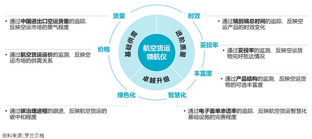 在此背景下,罗兰贝格发布《中国跨境航空货运白皮书(2022)》,建立跨境航空货运领航仪,肩负掌舵使命,全方位解读市场发展趋势,以期帮助业内玩家更好把握发展机遇。(一)中国跨境航空货运“领航仪”发布1.中国跨境航空货运领航仪——核心参数相比基础的货量价格监测,罗兰贝格基于三大维度,选取七大重要领航仪参数,综合评估中国跨境航空货运的发展态势,包括: