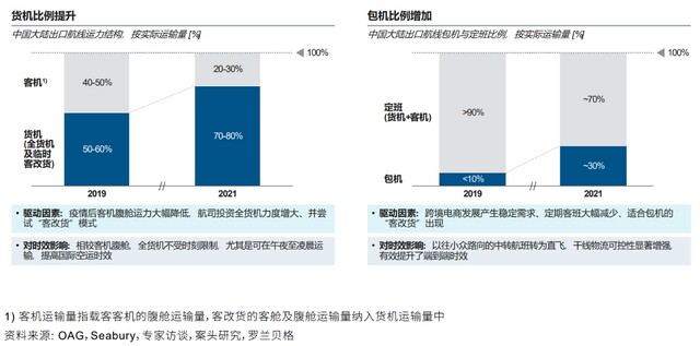 全货机不断投入,提升时效可靠性及灵活度;包机比例增加,带动直飞比例与衔接效率提升;多方玩家建立端到端能力,均驱动整体时效的不断缩短。案例-全货机投入:2021年,国货航根据市场需求增设一条重庆-芝加哥的全货机航线,同时不断增投法兰克福、洛杉矶、伦敦、迪拜等客改货航班,保障了中国中西部地区对外贸的运力供给与供应链稳定性。