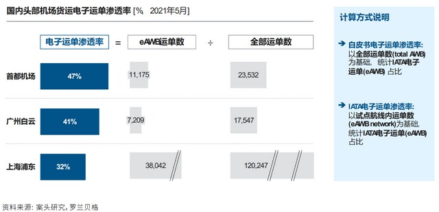 智慧化: 多方稳步推进智慧化进程,但尚具追赶空间:因电子运单可较显性降本增效,且是物流全程可视、节点无人操作等智慧化的基础,我国正积极推进电子运单。目前三大货运机场电子运单渗透率达30-45%。货代、航司、海关多方主体标准统一与系统打通是推动电子运单的重要因素。
