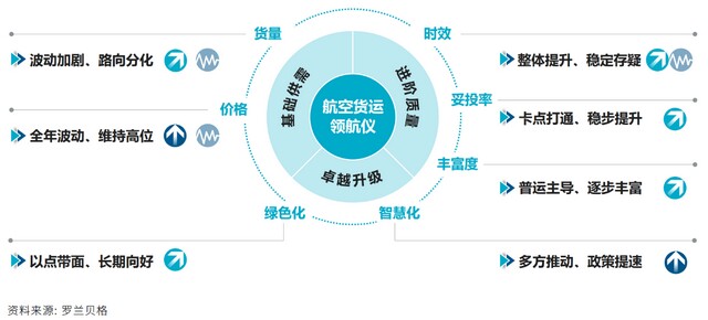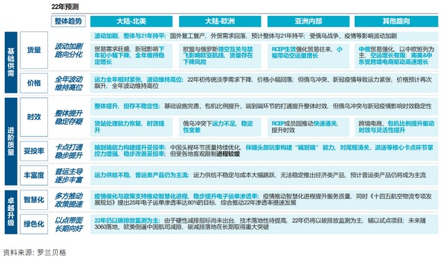 货量: 波动加剧、路向分化:22年初海外复工、黑天鹅事件爆发使得货量波动加剧。各路向分化明显,北美路向需求基底稳定,具有小幅增长潜力;欧洲路向受俄乌冲突,货量存在下降风险。运价: 全年波动、维持高位:黑天鹅事件再次造成运力紧张,原油价格上涨带动运价飙升,预计全年波动维持高位。时效: 整体提升、稳定存疑:随基础设施完善、端到端环节打通,时效整体提升,但受黑天鹅影响短期稳定性不足。妥投率: 卡点打通、稳步提升:随头部玩家对尾程清关等核心卡点掌控力增强,稳步改善妥投率,但受各地物流条件限制,进程相对缓慢。产品丰富度: 普运主导、逐步丰富:22年初运力供给波动、运价大幅跳跃,以拼仓为核心的经济性产品受到影响,22年预计普运类产品仍将为主流。智慧化: 政策提速、多方推动:疫情推进智慧化进程,减少对人工依赖程度。同时《十四五航空物流专项发展规划》支撑电子运单发展,预计22年渗透率持续提高。绿色化: 以点带面、长期向好:短期内航空货运减排仍以监测核算为主。长期而言, 3060双碳战略落地与技术突破或将推动碳减排取得重大进展。四、启示:莫为浮云遮望眼,风物长宜放眼量总结历经局势错综的上半年,市场似乎开始接受在VUCA迷雾之中的平衡打破与秩序重构。伴随话语权不断提升,中国货主逐步向服务敏感转变,对物流服务可靠性、服务深度等要求显著上升。跨境物流市场逐渐“拨云见日”,物流玩家如何围绕客户本质需求、在浮云中找到本色、从竞争中脱颖而出,货主如何平衡供应链质量与成本,以下针对性举措供各方参考。(详细内容请点击“阅读原文”获取完整版白皮书)运力提供方> 持续优化机队结构,重视全货机的引进