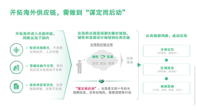 企业在开拓海外供应链时会进入全新环境,面临更大的不确定性,风险远高于国内。因此有必要先做好规划,平衡韧性和资源,规划到位再实施。