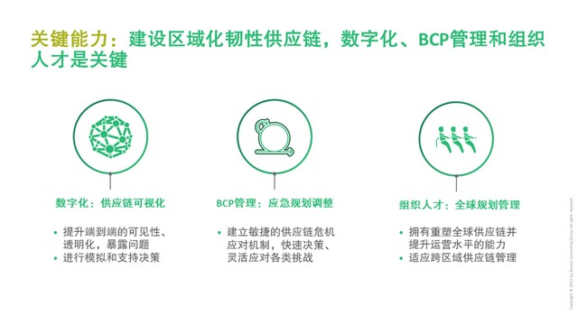 建设区域化韧性供应链,还需提升供应链数字化可视化、业务连续性计划(BCP)、全球规划管理等关键能力。