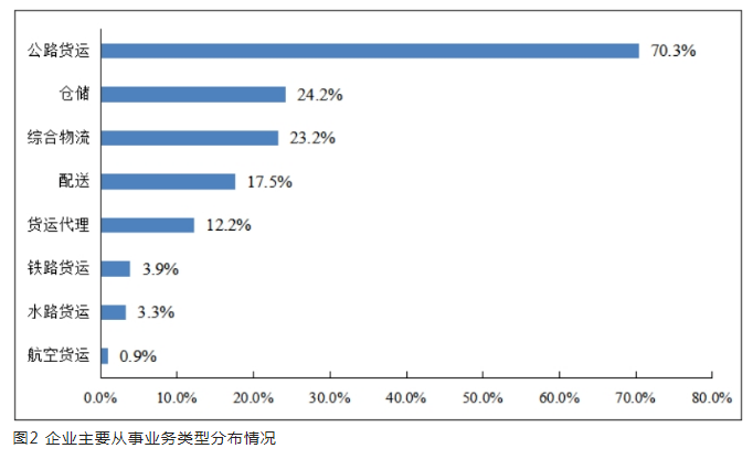 Small, medium-sized and micro logistics enterprises mainly focus on the field of road freight transportation. According to the survey data, 70.3% of the surveyed enterprises are engaged in road freight business, followed by warehousing and integrated logistics business, accounting for 24.2% and 23.2% respectively. Relatively few enterprises are engaged in railway, waterway and air freight, especially air freight, accounting for only 0.9%. This also reflects that the road freight market is large and scattered compared with other fields.