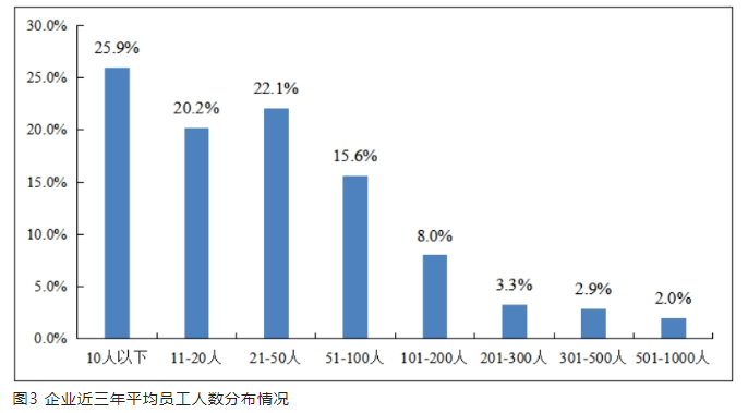 The income scale of the surveyed enterprises is small, and nearly one third of the enterprises have an average main business income of less than 1 million yuan in recent three years. According to the survey data, 40% of enterprises with an income scale of less than 2 million yuan belong to micro enterprises, 37.9% of enterprises with an income scale of 2-30 million yuan belong to small enterprises, and 17% of enterprises with an income scale of 30-300 million yuan belong to medium-sized enterprises.