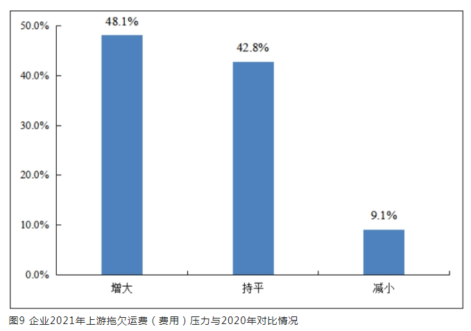 The surveyed enterprises reflect that the pressure of upstream freight (cost) arrears is increasing. According to the survey data, nearly half of the surveyed enterprises reported that the pressure of upstream freight arrears (expenses) increased compared with the previous year, and more than 40% of enterprises reported that they were flat. Logistics enterprises have faced great financial pressure due to the accounting period requirements. If the upstream enterprises default on the freight again, once the working capital chain breaks, the enterprises will have to withdraw from the market, increasing the instability of the market. Due to the characteristics of multi-level subcontracting of logistics business, it is difficult to implement the provisions on arrears in the regulations.