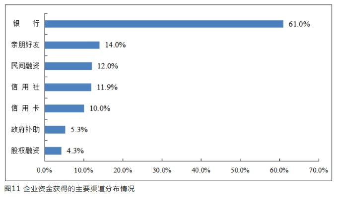 The financing channels of the surveyed enterprises are relatively single. According to the survey data, 61% of enterprises obtain funds mainly through banks and 11.9% through credit cooperatives; One third of the funds were obtained through loans from relatives and friends, private financing and credit cards, and only 4.3% were obtained through equity financing.