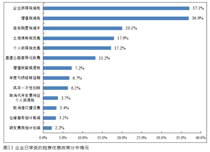 Small, medium-sized and micro logistics enterprises urgently need to increase tax support. According to the preferential tax policies enjoyed by the surveyed enterprises, the industry inclusive policies are well implemented. More enterprises enjoy the policies of enterprise income tax reduction and value-added tax reduction, accounting for 37.1% and 36.9% respectively, 20.1% of enterprises enjoy the policy of halving Trailer purchase tax, and more enterprises enjoy personal income tax preference.