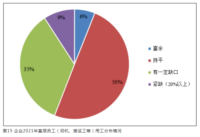 Compared with the previous year, the grass-roots employment of small, medium-sized and micro enterprises was generally flat, with a certain gap. According to the survey data, half of the enterprises reported that the employment situation of grass-roots employees (drivers, porters, etc.) remained basically stable compared with the previous year, more than one-third of the enterprises reported that there was a certain gap in the employment situation, and less than 10% of the enterprises said they were in short supply. Enterprises with certain gaps are mainly distributed in the fields of road freight, comprehensive logistics and warehousing business.