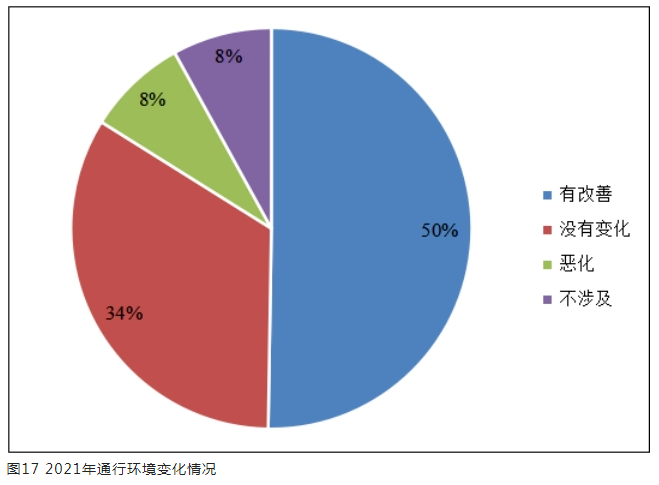 Small, medium-sized and micro logistics enterprises reported that the vehicle traffic environment was generally improved over the previous year. According to the survey data, half of the enterprises reported that the vehicle traffic environment had improved compared with the previous year, and 34% of the enterprises reported that the traffic environment had not changed compared with the previous year. Enterprises generally reflect that the traffic environment of expressway is better than that of national and provincial roads.