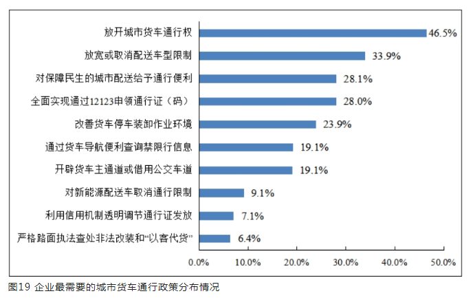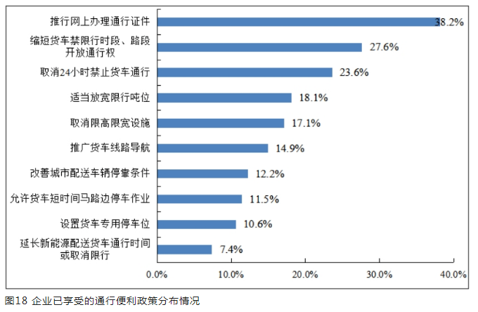 Enterprises reported that the overall enjoyment of policies and measures such as improving the parking conditions of urban distribution vehicles, allowing trucks to park on the road beyond time, setting up special parking spaces for trucks, prolonging the passage time of new energy distribution trucks, and canceling the traffic restrictions of new energy distribution trucks was insufficient.