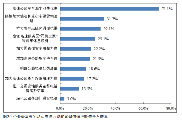 In terms of truck traffic on expressways and national and provincial roads, the most needed traffic policy for enterprises is the preferential policy of halving the toll of empty vehicles on expressways. More than 70% of enterprises choose this policy measure, reflecting the overall consensus and policy expectations of industry enterprises. It is understood that with the adjustment of charging mode, a large number of empty vehicles choose to take national and provincial roads, and the traffic volume of highway trucks has declined, which has reduced the income of highway companies to a certain extent and caused idle waste of highway assets.