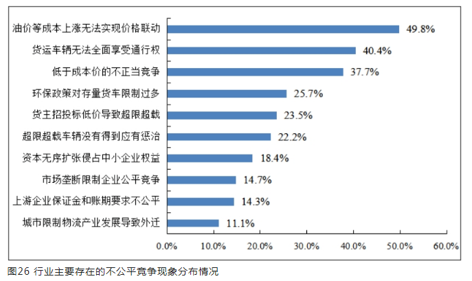 The surveyed enterprises believe that there is unfair competition below the cost price in the logistics market, especially in the road freight market. According to the survey report on the employment status of truck drivers in 2021, the freight Internet platform has become an important channel for individual drivers to find sources of goods. For the problems existing in the use of individual drivers' Freight Internet platform, the biggest reflection is the behavior of lowering freight rates. 78.8% of drivers believe that there is the behavior of lowering freight rates, accounting for nearly 80%. This is the same problem for small, medium-sized and micro enterprises. Unfair competition below the cost price disrupted the market order, resulting in low profit level of small, medium-sized and micro enterprises and unable to be put into reproduction.