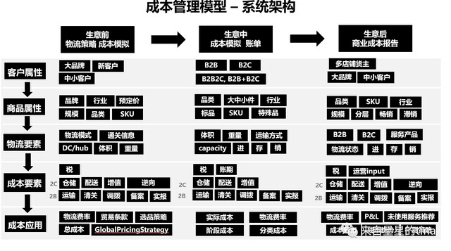 Pre business: Cost Simulation and logistics strategy. Cost simulation mainly looks at the proportion of logistics costs of various categories and SKUs according to commodity attributes, logistics elements and cost elements. Logistics strategy refers to the logistics mode or link to be selected, whether the B2C part is direct mail or stocking to dc/cdc/rdc; What kind of transportation mode and trade terms should be adopted in B2B?