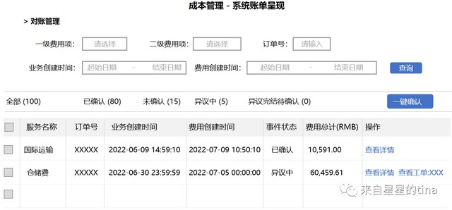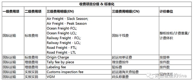 After entering the routine business flow, regular and clear bills are very important. It often happens that customers are lost because the bill is not clear. Especially when there are many customers, and the same customer also carries out multiple business cooperation, and there are B2B and B2C businesses at the same time, it is easy to have unclear bills and chaotic accounting periods. A good bill needs to start from three aspects: charge items, reconciliation process and accounting period. What digitalization needs to do is to have a clear presentation on the system. 1. The name of charging items should be unified upstream and downstream, and the name of charging items should be clear and concise. At the same time, the name of suppliers and clients should be unified, so that reconciliation is easy. When multiple businesses are carried out at the same time, many charges are very complex. The same charge item often appears, and the names often appear on the bill are different. The supplier's bill and the bill to the customer are also diverse, so it is impossible to reconcile at all. The charging items can be divided into three levels: first level fee items: service items. For example, international transportation is a first-class project. Level 2 expenses: they can be divided into three categories: standard expenses (as long as the service is used, there must be); Value added expenses (in addition to the fixed expenses, the expenses arising from the value-added services actively requested by customers); Reimbursed expenses (not within the scope of quotation, the expenses charged by the third party may not occur, but there must be vouchers) level 3 expense items: more detailed than level 2. For example, sea freight, air freight and customs clearance fees in standard fees; Among the value-added expenses, the fees for marking, dismantling, labeling, and labeling; The inspection fee and dock weighing fee in the actual expenses.